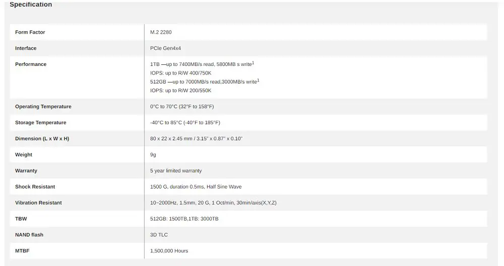 ▼最大速度は1TBモデルがリード7,400MB/s、ライト5,800MB/s。今回提供いただいた512GBモデルはリード7,000MB/s、ライト3,000MB/sとなっている