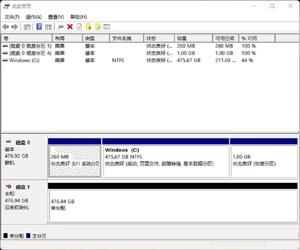 ▼「ディスクの管理」を起動すると未フォーマットであることがわかる