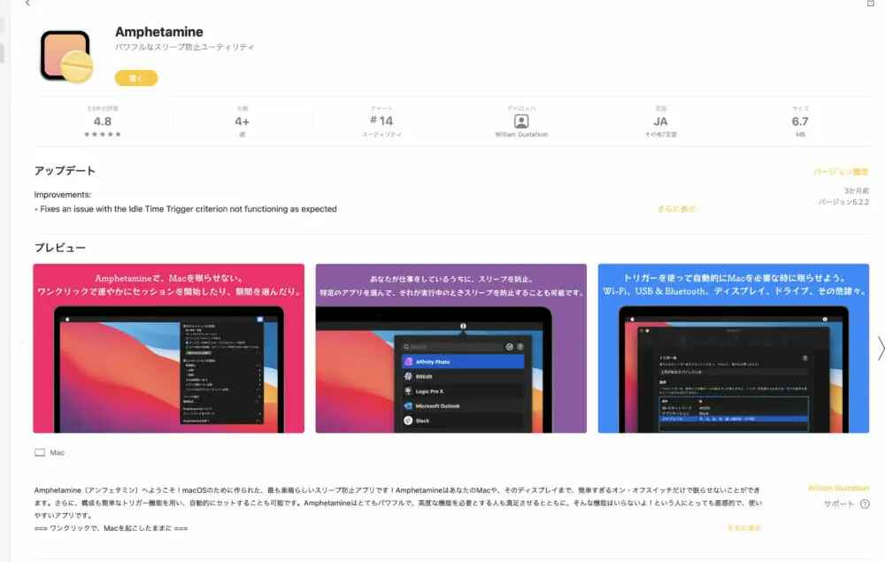 「Amphetamine」は、Macのスリープモードに入るタイミングをコントロールし、大きなファイルのダウンロードや動画書き出しの中断を防ぐことができるアプリです。