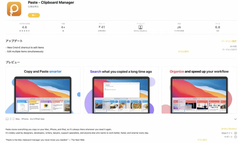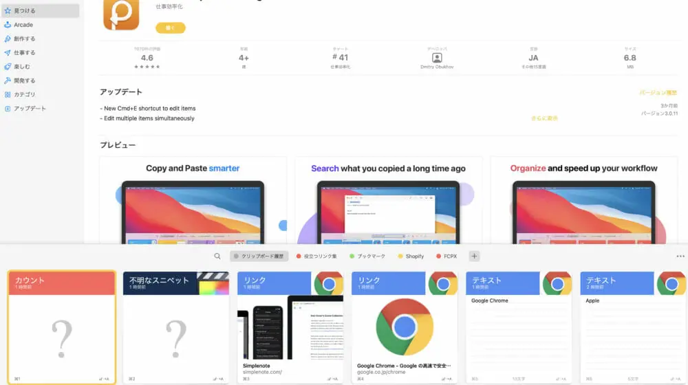 こちらは有料(月額200円、年間1,680円のサブスクリプション)となりますが、まさに全Macユーザーに必須と言えるクリップボードアプリです。