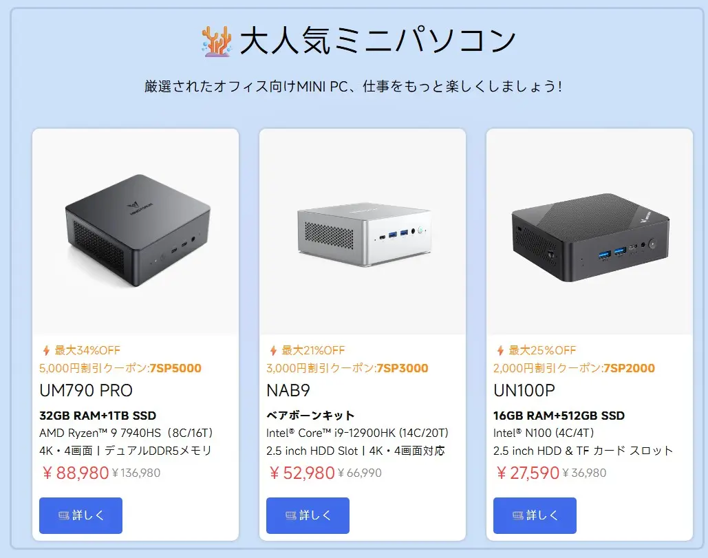 中には半額近い割引が適用されているモデルもあり、ミニPCの購入を検討している方にとって、まさにうってつけのチャンスとなっています!