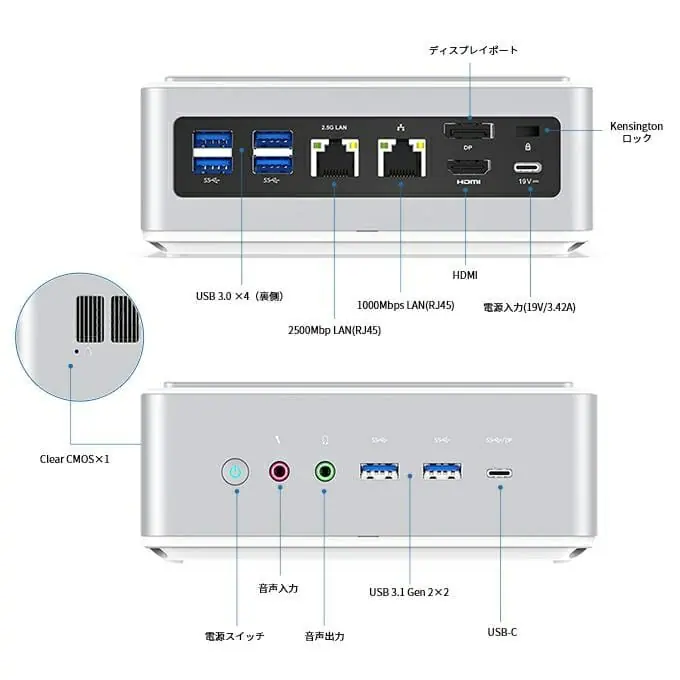 | 拡張要素 | M.2 2280 PCle 3.0 SSD(拡張上限なし) DDR4 デュアルチャンネル SODIMMスロット×2(合計64GBまで拡張可能) 2.5 inch SATA HDDスロット×2(拡張上限なし) |