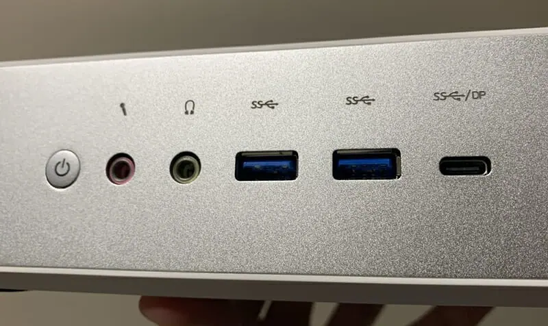 ▼本体前面。左から『電源ボタン』『マイクジャック』『イヤホンジャック』『USB3.1ポート』×2『USB Type-Cポート』などが用意。