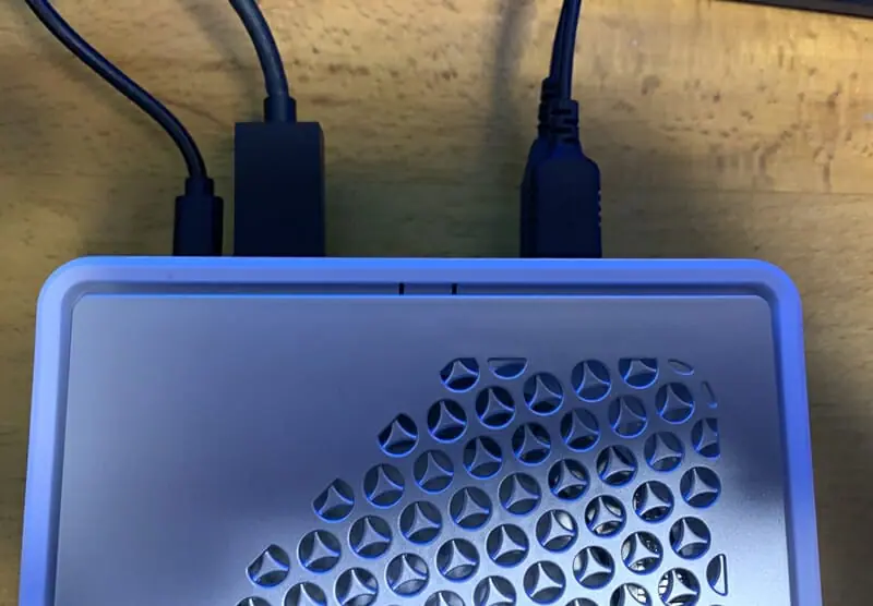 ▼実際にマウス・キーボード・HDMI・LAN・電源ケーブル類を接続した様子。画像の様に背面がコードだらけになるため、よりスマートに利用したい場合は無線タイプの機器を使用すると良いだろう。