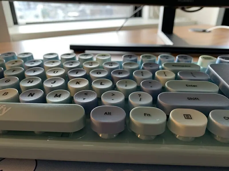 キーボードはUS配列の104キー構成。各キーは丸形のデザインとなっており可愛らしい。