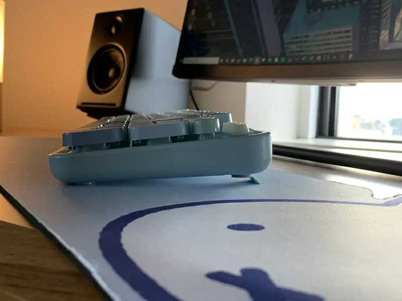 ▼厚みは35mmほど。キーの押し込み幅が深い分、一般的なキーボードよりは若干厚めだ。