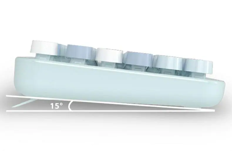 ▼上部のスタンドを展開することで、キーボードをデスクに対して15度の角度で設置することが出来る。タイピングしやすい角度だ。