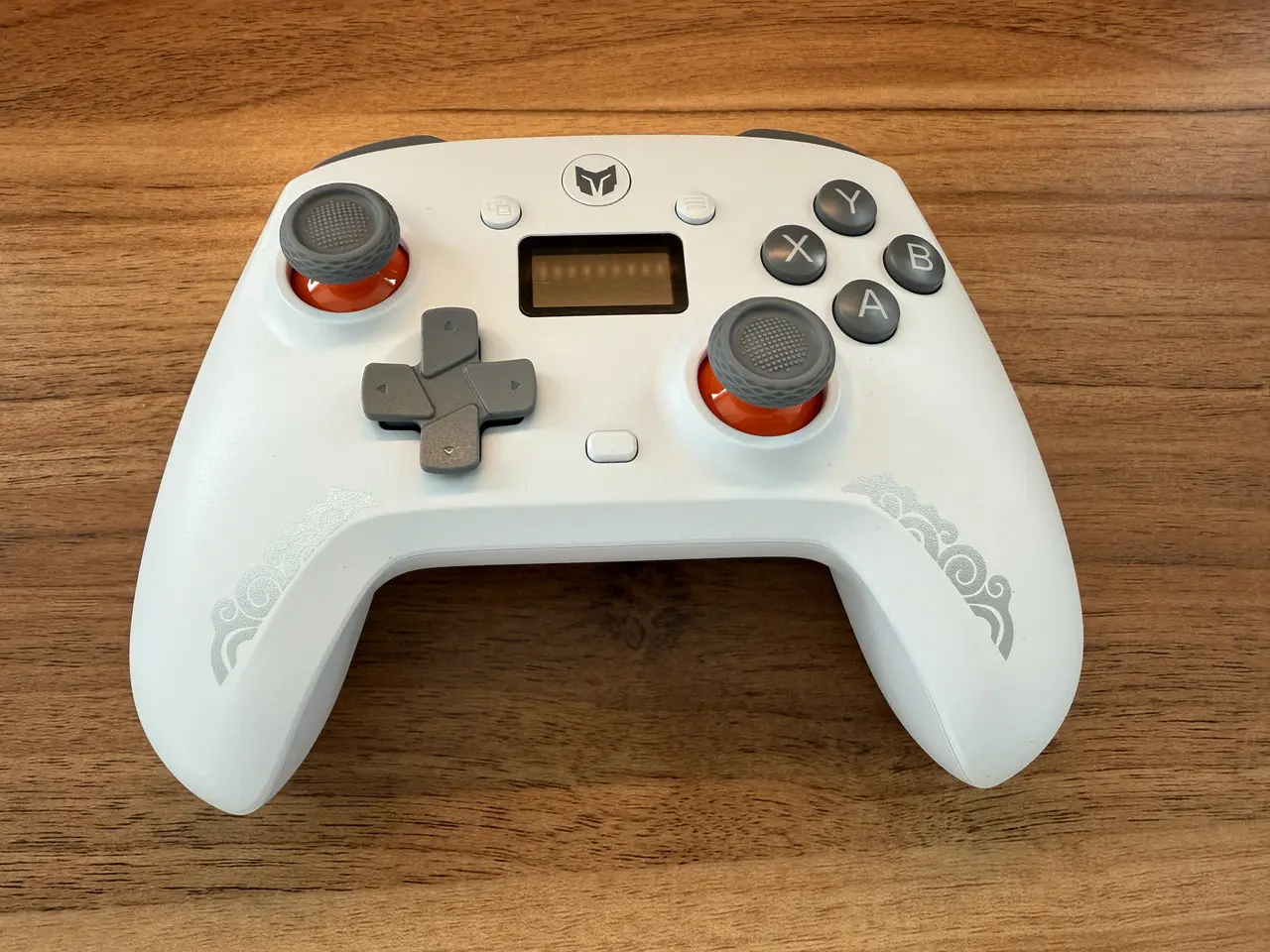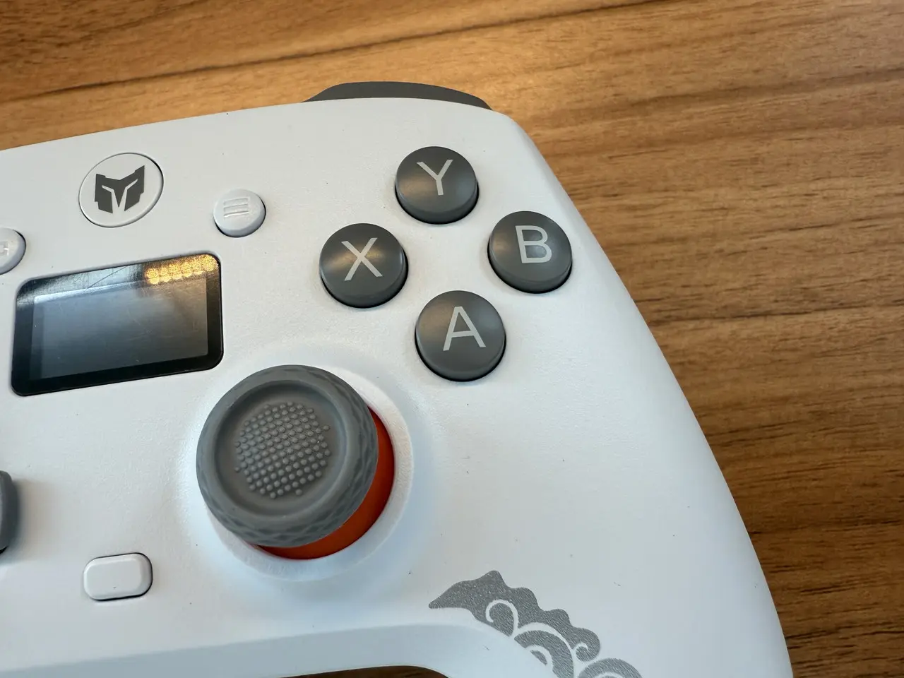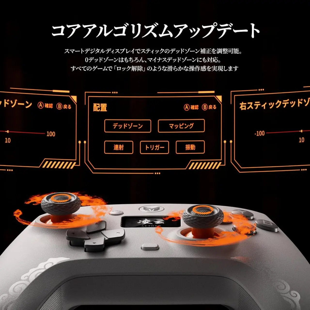 前面中央にLCDディスプレイを備えており、背面ボタンへの割り当て、ジョイスティックの感度曲線やデッドゾーン(0デッドゾーンおよびマイナスデッドゾーンを含む)の調整を行ったり、振動レベルやジョイスティック、トリガーの補正機能を直感的に行うことが可能。