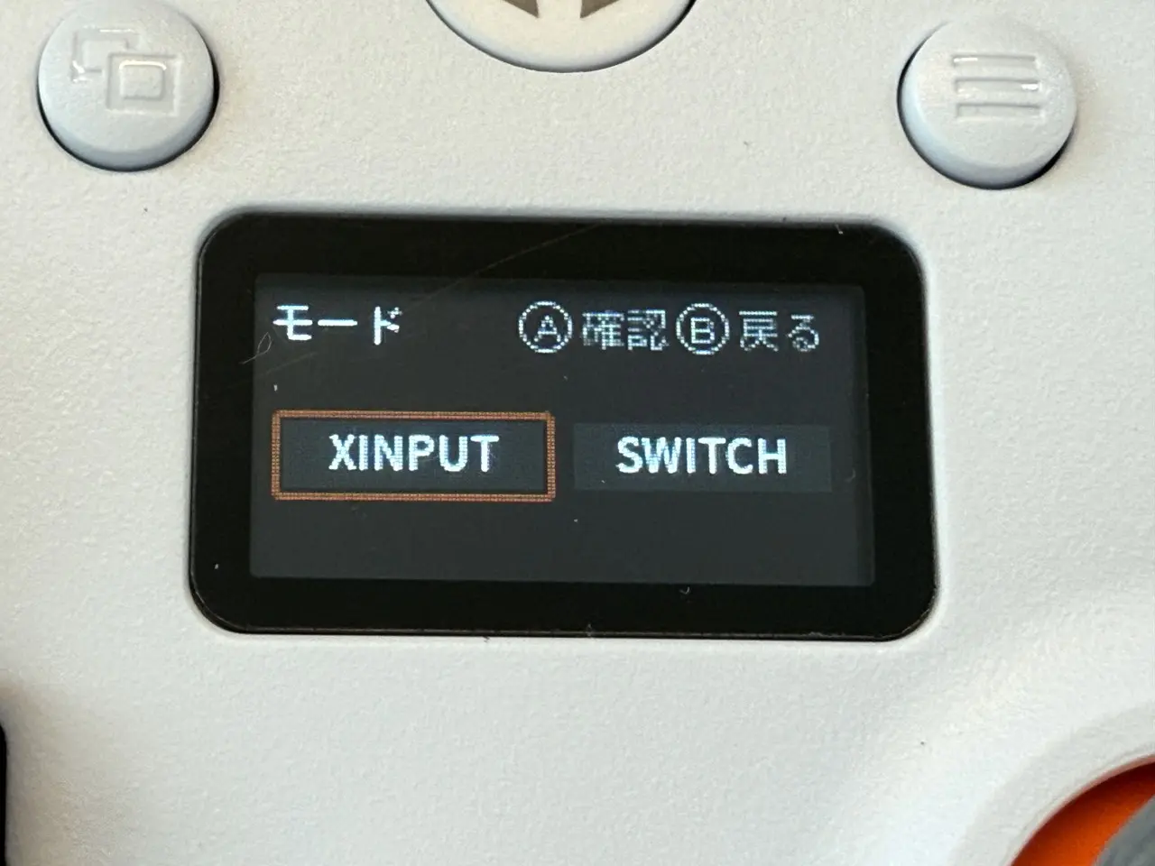 ▼なお、メニュー画面の「モード」から、接続先を XINPUT(PC) と SWITCH(ニンテンドースイッチ) のいずれかに切り替えることができる。