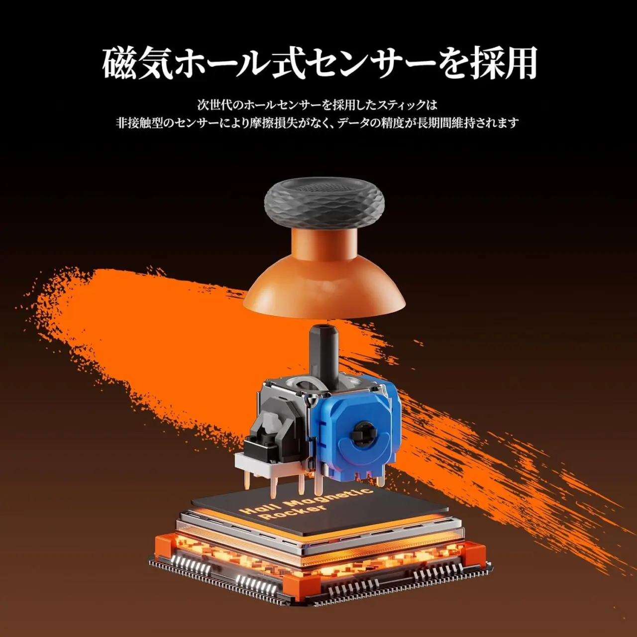 そして左右のスティックには、磁気ホール式センサーを採用。非接触型のセンサーにより摩耗損失がなく、高精度な入力を長期間保つことができる。