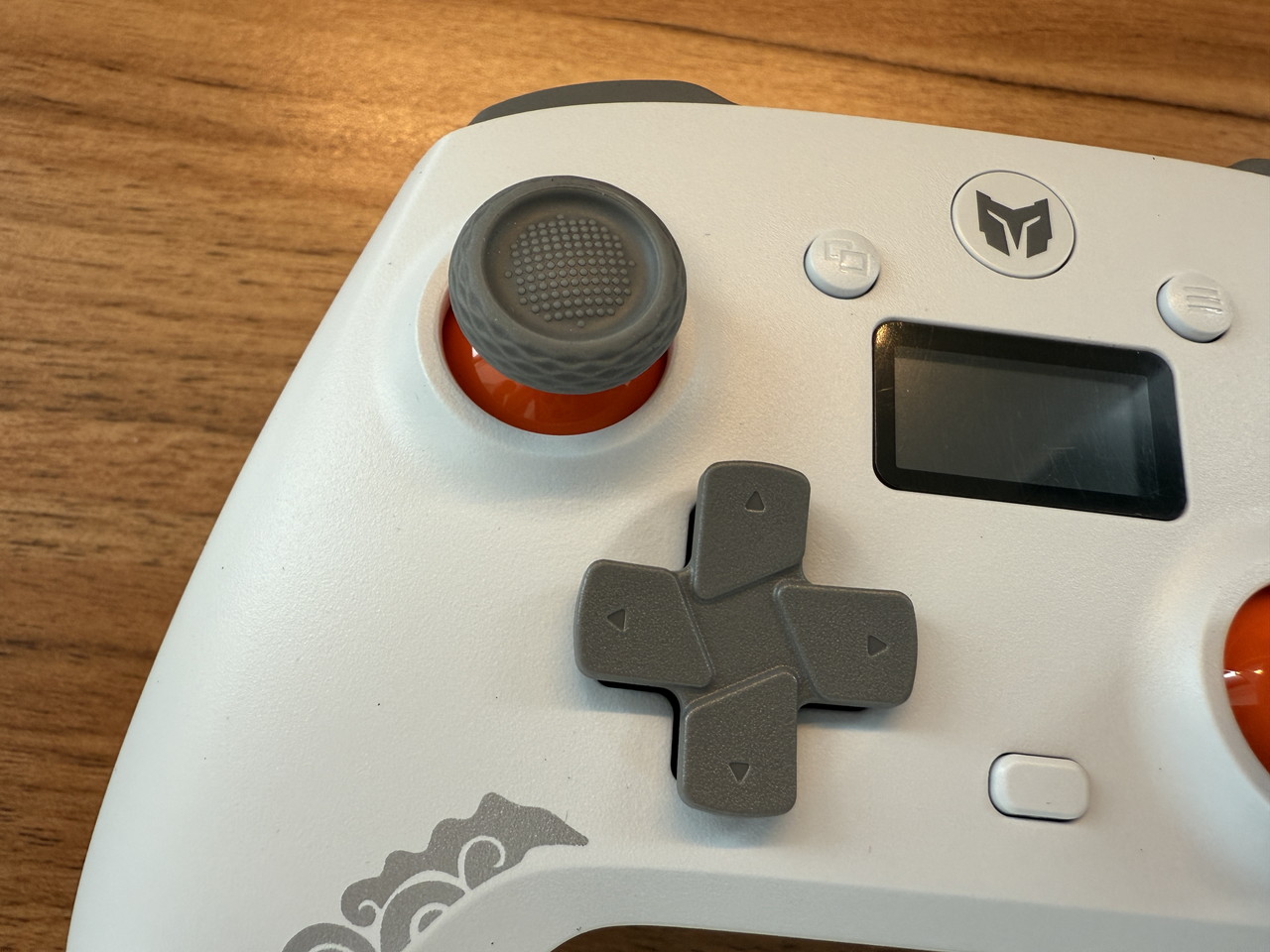 前面中央にLCDディスプレイを備えており、背面ボタンへの割り当て、ジョイスティックの感度曲線やデッドゾーン(0デッドゾーンおよびマイナスデッドゾーンを含む)の調整を行ったり、振動レベルやジョイスティック、トリガーの補正機能を直感的に行うことが可能。