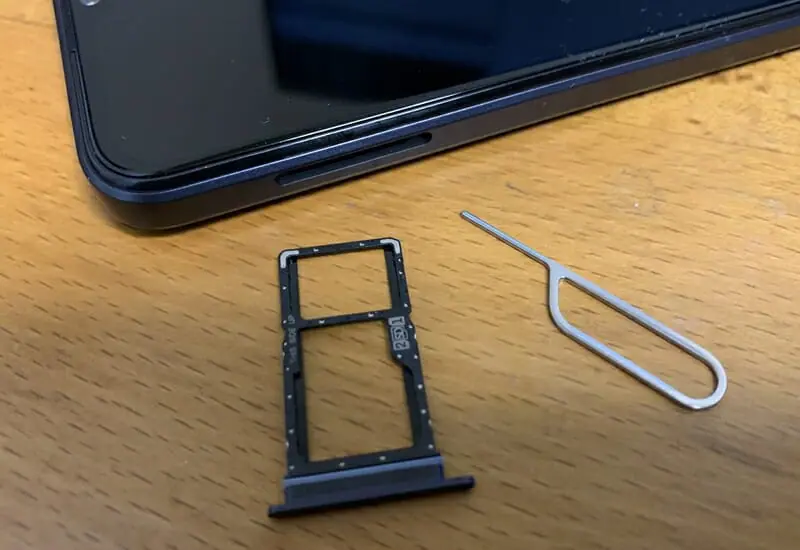 ▼付属のピンでカードスロットを開き、SIMカードやマイクロSDカードの挿入が可能となる。