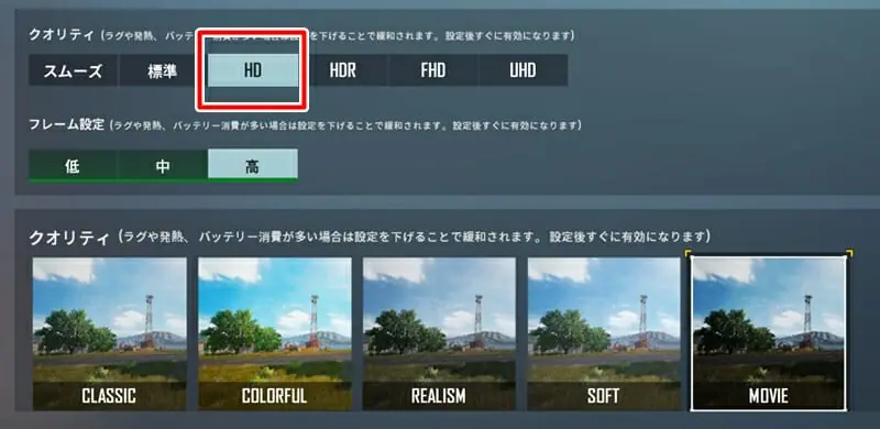 まずグラフィッククオリティに関しては『HD』までを選択することが出来た。