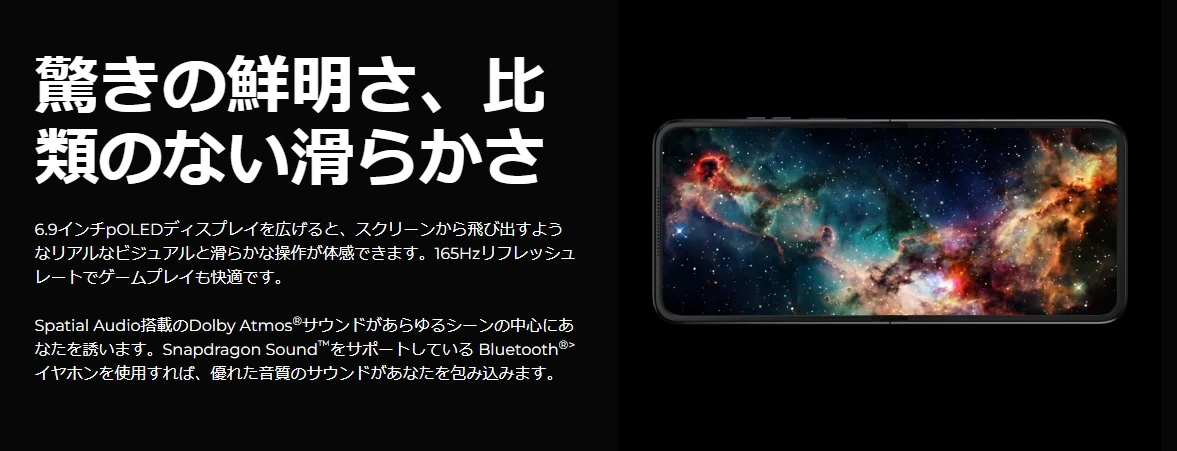 6.9インチのメインディスプレイは2,640x1,080解像度、最高165Hzのリフレッシュレートに対応しており、滑らかで高精細な映像を楽しめます。