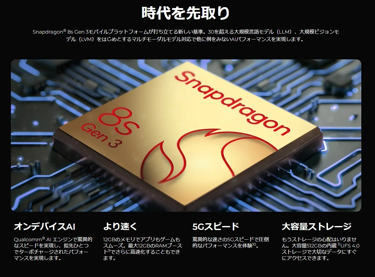 CPU(SoC)に「Snapdragon 8s Gen 3 オクタコアプロセッサー」を、RAMには12GB LPDDR5Xを採用。ハイエンド級のパフォーマンスを実現しており、ウェブサイト閲覧や動画視聴はもちろん、ヘビーなゲーミングまでスムーズにこなせる性能を備えています。