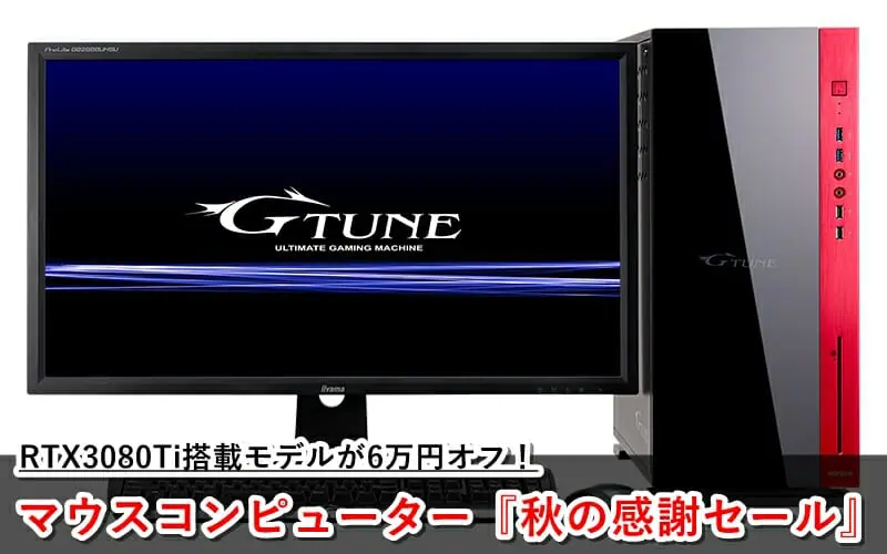 同サイトにおいて、『RTX3090』や『RTX3080Ti』などのハイエンドグラボを搭載したゲーミングPCを、最大60,000円オフの超特価で購入できる、期間限定『秋の感謝セール』が開催されます!