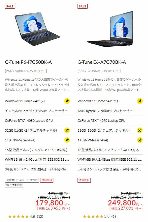 ▼また、ノート型のゲーミングPCもセールラインナップに並んでいます。