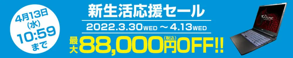 同サイトにおいて、RTX3000台のハイエンドグラボを搭載したゲーミングPCについて、最大88,000円(税込)オフの割引が適用された超特価で購入できる、期間限定『新生活応援セール』が開催されます!