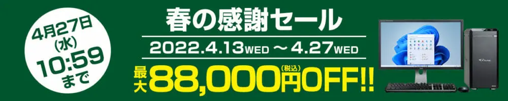 同サイトにおいて、RTX3000台のハイエンドグラボを搭載したゲーミングPCについて、最大88,000円(税込)オフの割引が適用された超特価で購入できる、期間限定『春の感謝セール』が開催されます!