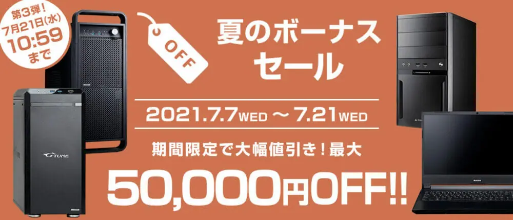 同サイトにおいて、RTX3090搭載ゲーミングPCを始めとした人気モデルを、最大50,000円オフの超特価で購入できる、期間限定『夏のボーナスセール(第3弾)』が開催中です!