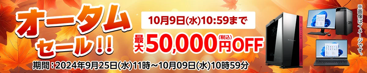 同サイトにおいて、RTX4000&3000台のハイエンドグラボを搭載したゲーミングPC等について、最大50,000円(税込)オフの割引が適用された超特価で購入できる、期間限定セール『オータムセール!!』が開催されます!