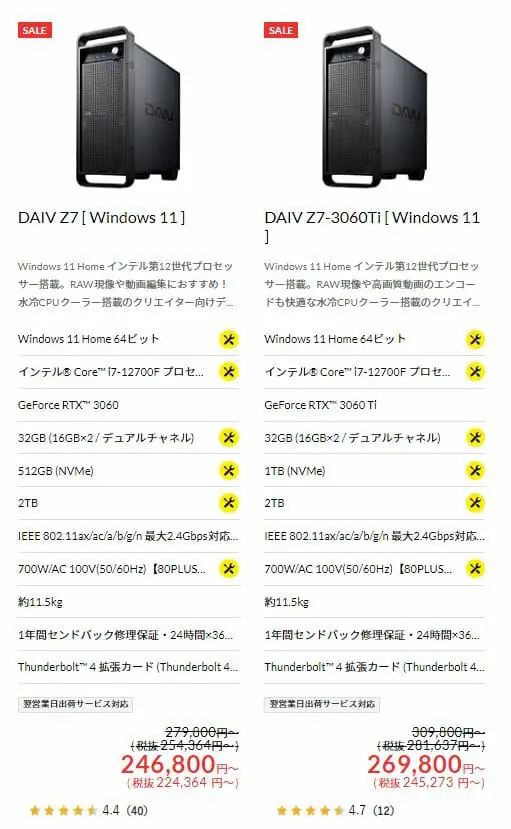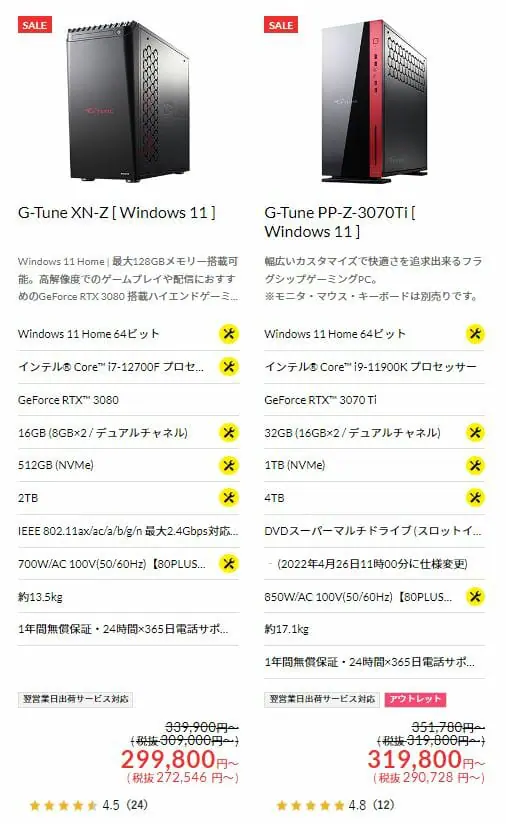 ▼『RTX3070』搭載のミドルハイ級モデルに関しても、4.5万円もの割引が適用されています。
