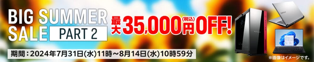同サイトにおいて、RTX4000&3000台のハイエンドグラボを搭載したゲーミングPC等について、最大35,000円(税込)オフの割引が適用された超特価で購入できる、期間限定セール『BIG SUMMER SALE Part2』が開催されます!