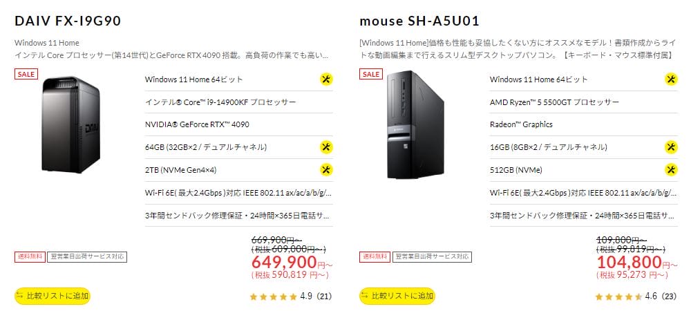 ハイスペックゲーミングPCから、ミドル級のゲーミングPC、そしてノート型からリモートワークに適した格安なビジネスモデルまで、幅広い製品がラインナップに並んでいます。