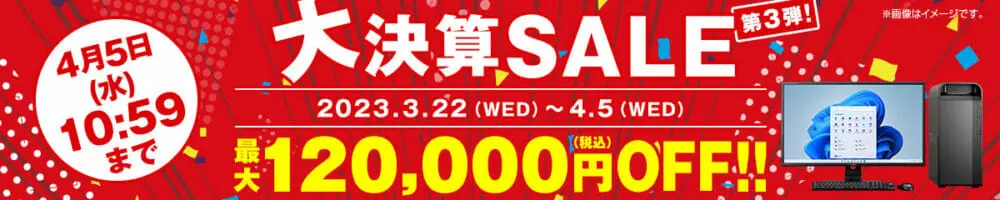同サイトにおいて、RTX4000&3000台のハイエンドグラボを搭載したゲーミングPC等について、最大120,000円(税込)オフの割引が適用された超特価で購入できる、期間限定セール『大決算SALE 第3弾』が開催されます!