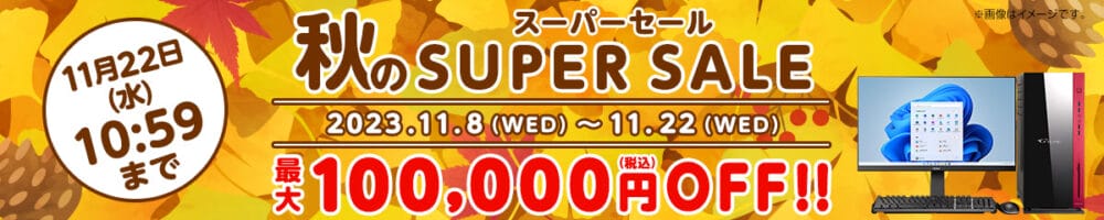 同サイトにおいて、RTX4000&3000台のハイエンドグラボを搭載したゲーミングPC等について、最大100,000円(税込)オフの割引が適用された超特価で購入できる、期間限定セール『秋のSUPER SALE』が開催されます!