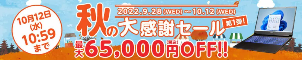同サイトにおいて、RTX3000台のハイエンドグラボを搭載したゲーミングPC等について、最大65,000円(税込)オフの割引が適用された超特価で購入できる、期間限定『秋の大感謝セール第1弾』が開催されます!