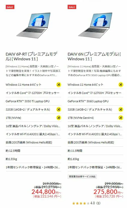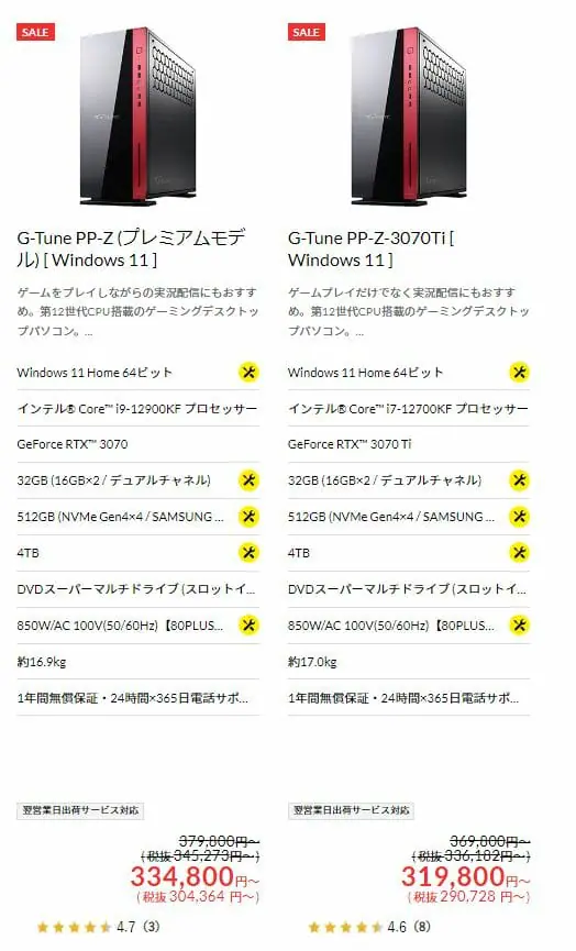 ▼『RTX3070Ti』搭載のミドルハイ級モデルに関しても、5.0万円OFFもの割引が適用されています。