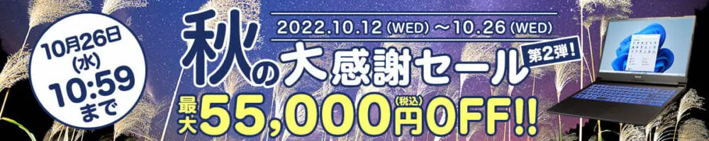同サイトにおいて、RTX3000台のハイエンドグラボを搭載したゲーミングPC等について、最大55,000円(税込)オフの割引が適用された超特価で購入できる、期間限定『秋の大感謝セール第2弾』が開催されます!