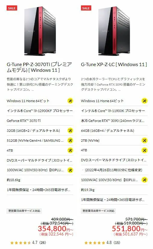 ▼水冷式の最上級グラボ『RTX 3090』と第11世代Core i9を搭載した最上級ゲーミングPCを、19,980円OFFの大幅割引が適用された価格で購入可能!『RTX 3070Ti』&第12世代Core i9搭載モデルには55,000円OFFもの割引が適用されています。