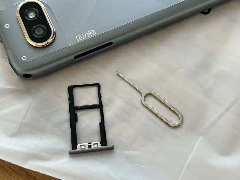 ▼付属のピンを用いてスロットを開き、デュアルnano SIMカード、もしくはマイクロSDカードの挿入が可能だ。