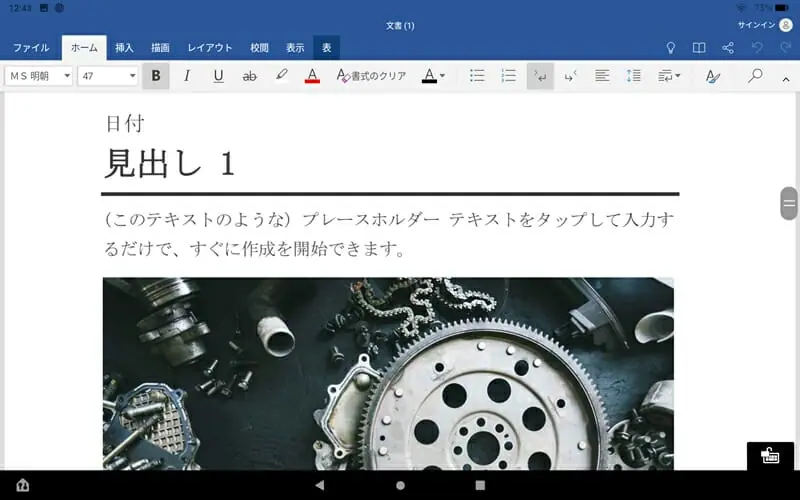 ▼『ワード』を使用した場合。専用のキーボード付きカバーを装着することで、ノートPCのようにスムーズなタイピングが可能であった。