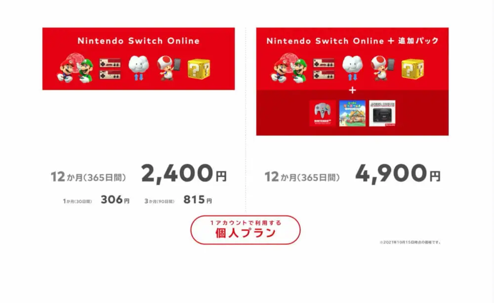 2021年10月26日(火) 家庭用ゲーム機Nintendo Switchの、オンラインサービス「Nintendo Switch Online」に、新たなプランが追加されました。