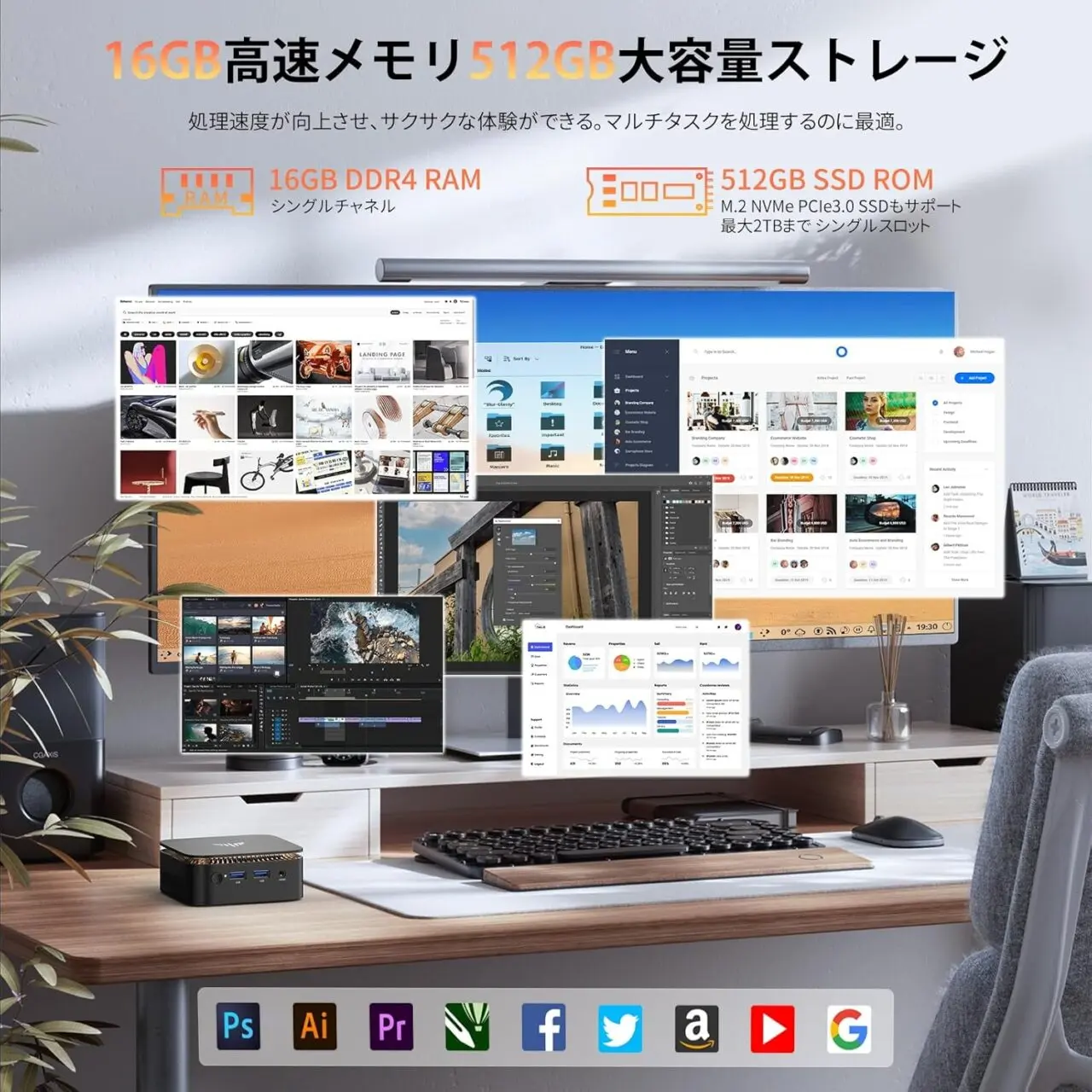 非常に小型ながら、一般的なデスクトップパソコンに引けを取らない実用性を備えた高性能ミニPCとなっています。