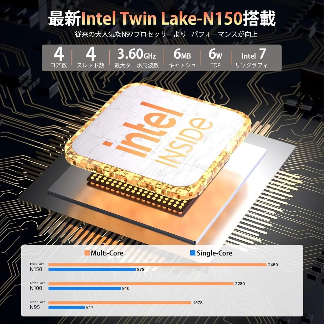 | CPU | 第12世代Intel Alder Lake-N150プロセッサー (最大周波数3.60GHz、4コア/4スレッド、6MBキャッシュ ) |