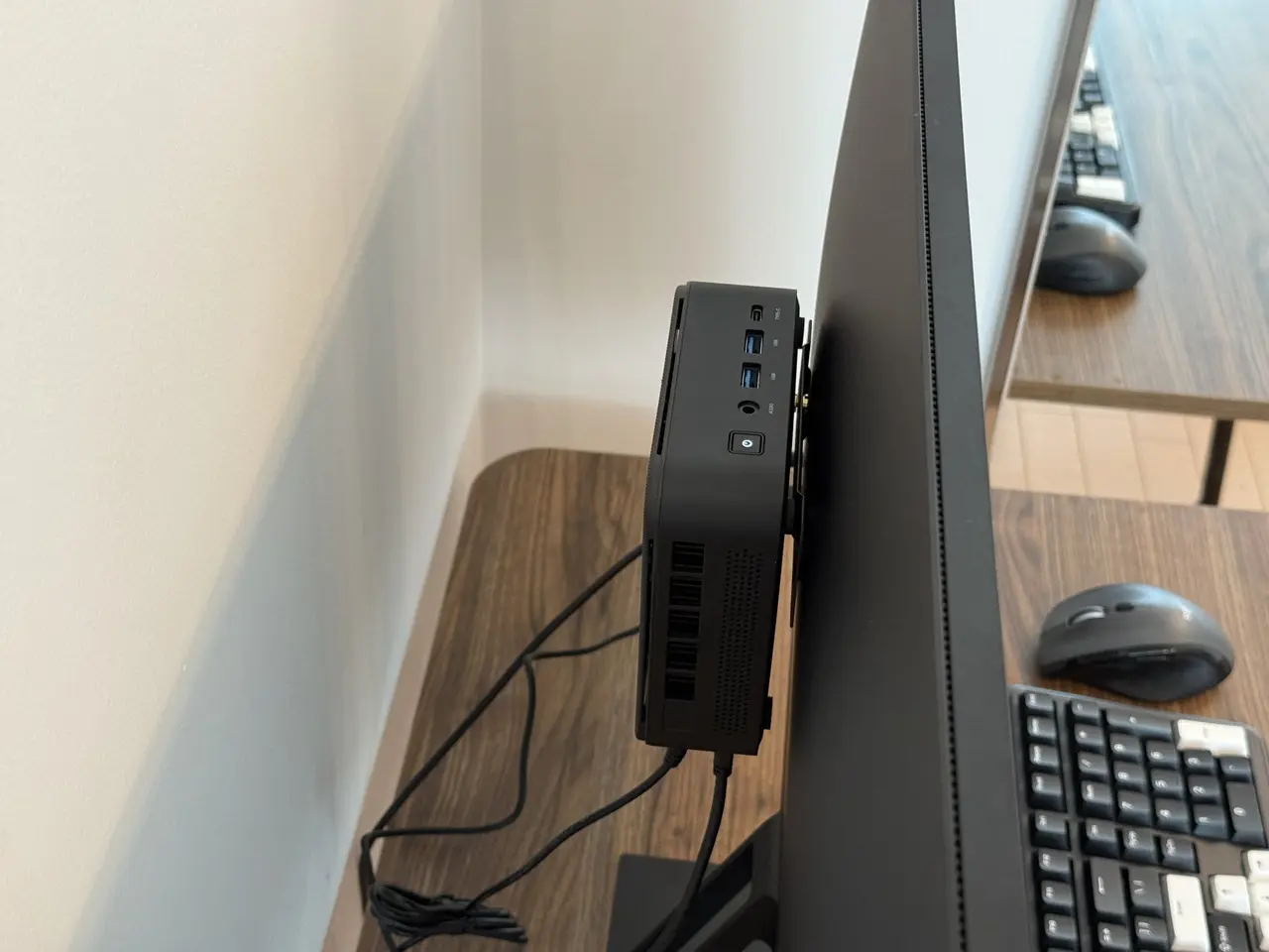 筐体背面にはVESA規格対応の穴が空いており、付属の壁掛けブラケットを使用して、モニター裏への取り付けが可能。さらなる省スペース化を実現できる。
