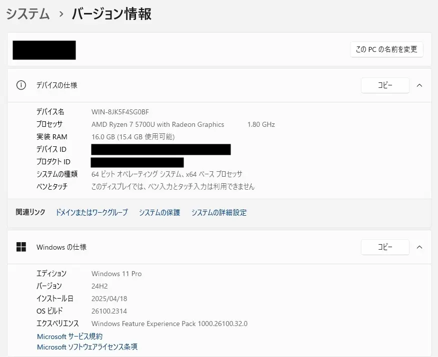 | CPU | AMD Ryzen 7 5700U (基本クロック:2.0 GHz / コアの数:8 / スレッド数:16 / 最大ブースト・クロック 最大 4.3GHz/ グラフィックス周波数:2000 MHz / L3キャッシュ: 16MB) |