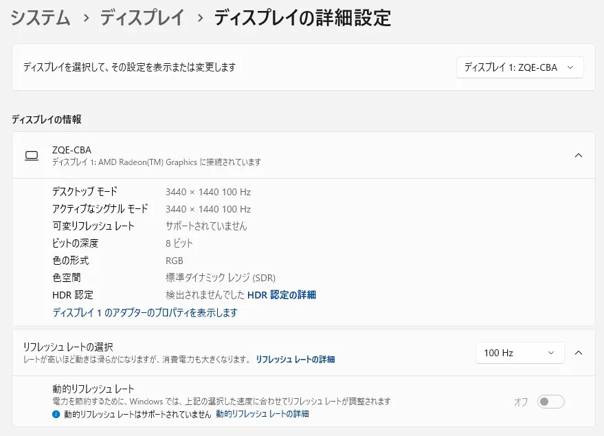 ▼映像出力情報。3440×1440・100fpsで快適に動作する。