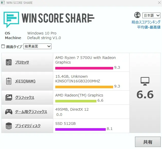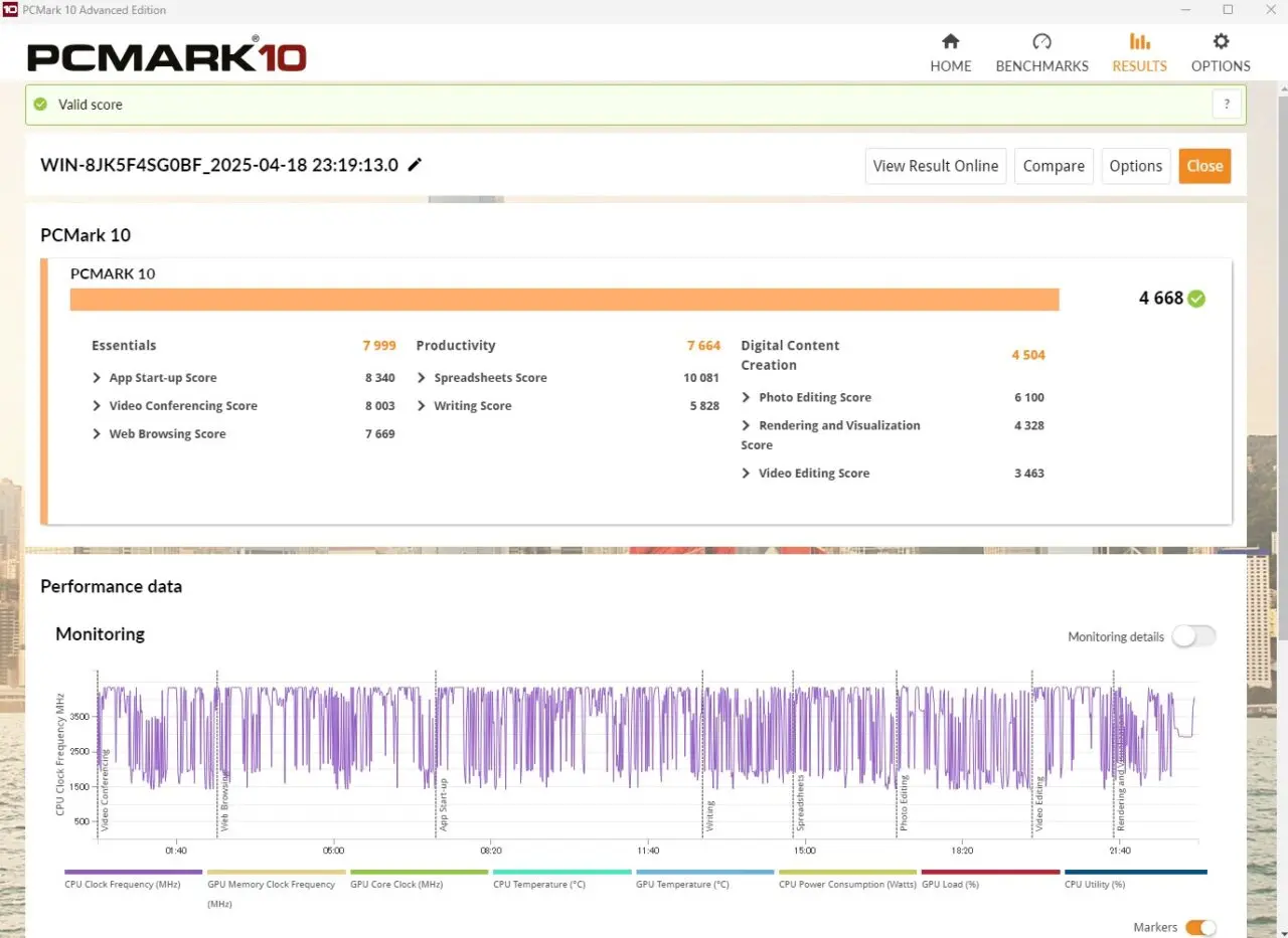 PCMARK10(有料版)のテスト結果は以下の通りとなった。