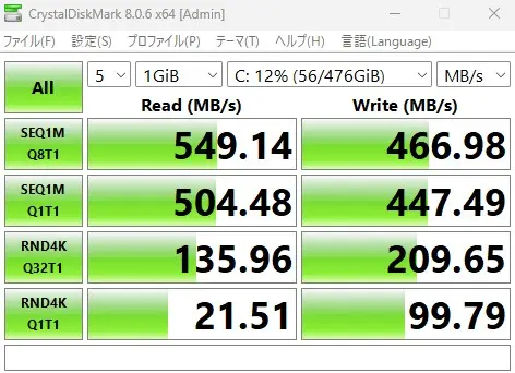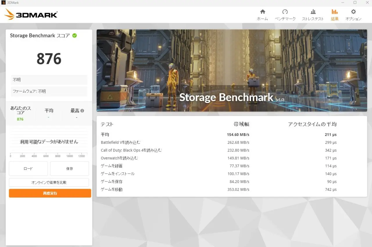 Storage Benchmarkでは、スコア876を記録。これはSATA SSDとしては標準〜やや高水準のパフォーマンスであり、Windowsやアプリの起動はもちろん、ゲームのロードやインストールも快適にこなせる。