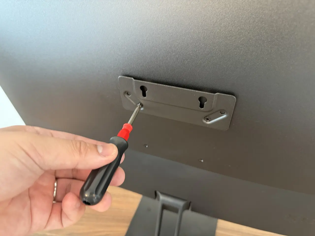 続いて、モニター背面に壁掛けブラケットをネジで固定。