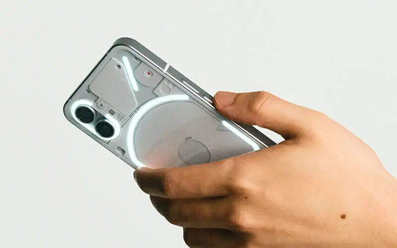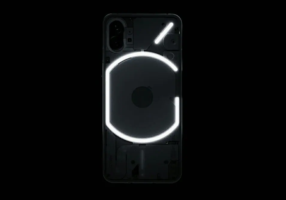 背面はスケルトンになっており、Glyph インターフェースと呼ばれるLEDライトが光ります。