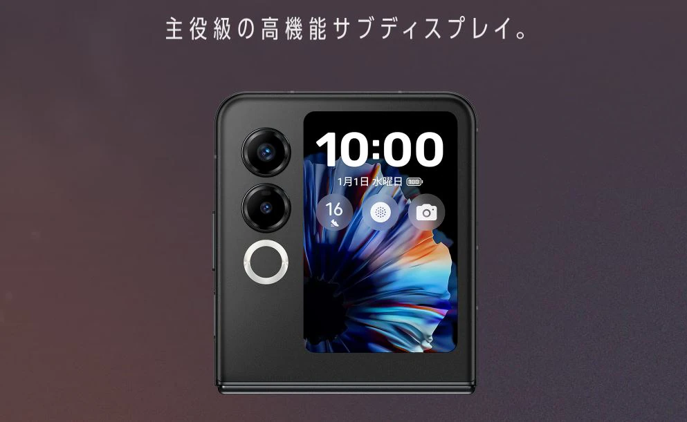 メインの6.9インチディスプレイに加え、背面に約3インチのサブディスプレイを搭載。CPU(SoC)には「MediaTek Dimensity D7300X」を採用、6GB RAM+128GBストレージを備え、おサイフケータイにも対応するなど、実用的かつ利便性に優れた構成の格安折りたたみスマホとなっています。