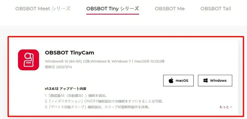 上記リンクより、OSに対応する最新ソフトウェア『OBSBOT Tinycam』をダウンロード&インストール。