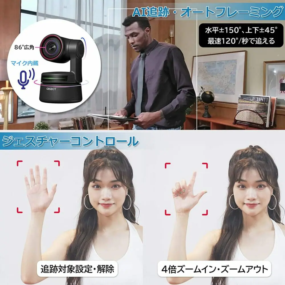 OBSBOT Tiny 4Kは、AI自動追跡機能を搭載しており、被写体の動きを自動で追跡することができる。2軸ジンバル内蔵、水平±150°、上下±45°の範囲で稼働し、カメラから離れている場合でも、簡単なジェスチャーで遠隔操作を行うことが可能だ。