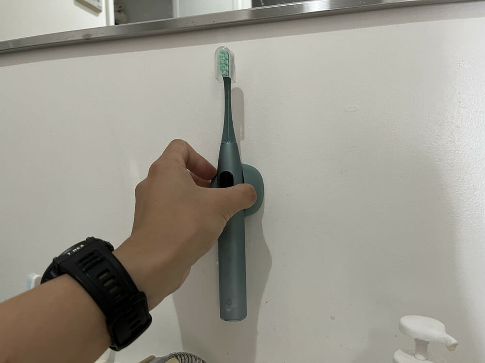 そしてパッケージには充電機能付き壁掛けスタンドが付属。使い終わった電動歯ブラシを設置するだけで急速充電が開始される。